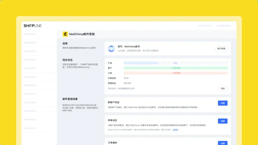 SHOPLINE 已经接入Mailchimp,跨境电商独立站商家的店铺可以轻松连接Mailchimp账户、将店铺数据同步至Mailchimp、触发自动化邮件营销。跨境电商商家可以在SHOPLINE应用中心安装Mailchimp插件后直接使用,具体常见问题解答可阅读SHOPLINE文章:MailChimp邮件营销。