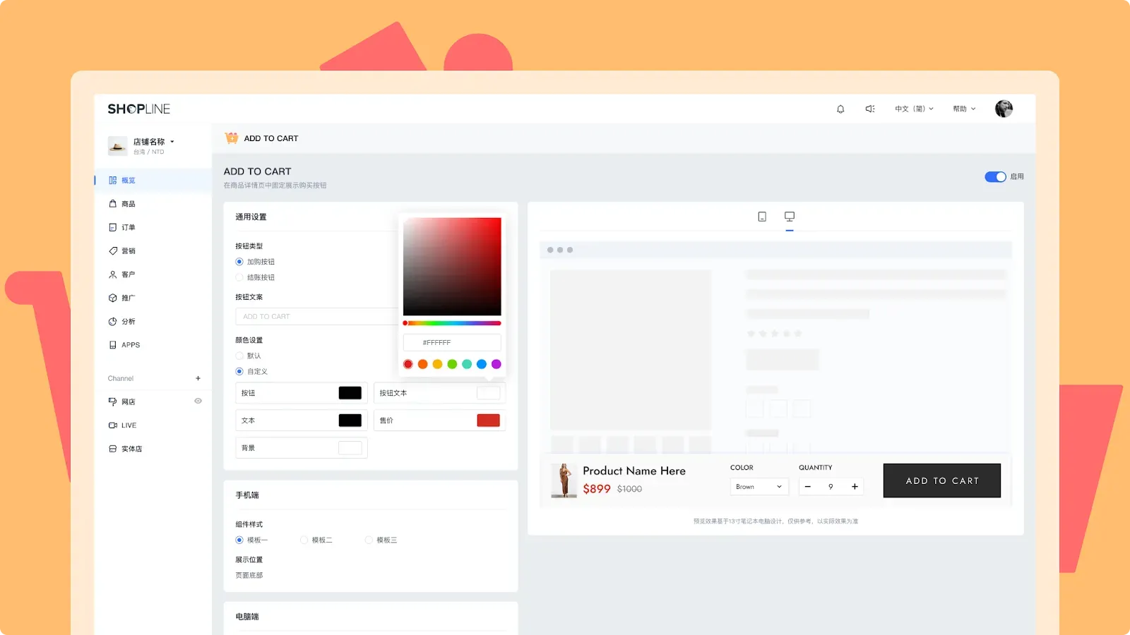 高质量的着陆页可以将广告点击转化为实际销售,是提高广告ROI的关键环节。SHOPLINE提供多种样式的加购和结账悬浮按钮,确保广告与着陆页内容高度一致,减少用户流失。简化购买流程,明确引导用户完成购买,有效提升转化率。
