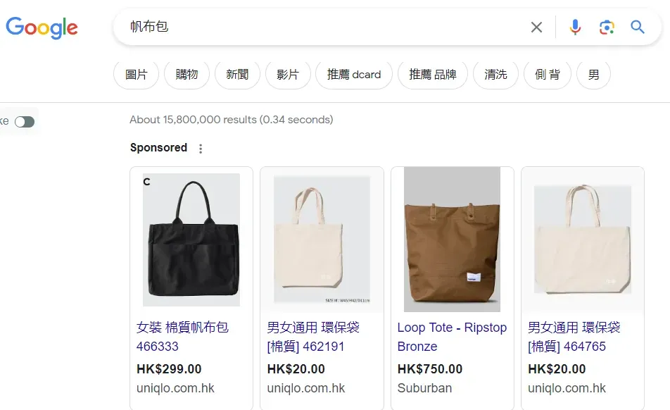 谷歌广告强大的广告分析工具和多样的广告投放格式,能够帮助广告主更好的预估投放效果,灵活地改变投放策略和投放组合,其中谷歌购物广告是基于电子商务的广告,在用户针对产品进行搜索时,能够让跨境电商的相关产品、价格、评价等都直接显示出来,例如搜索帆布包时: