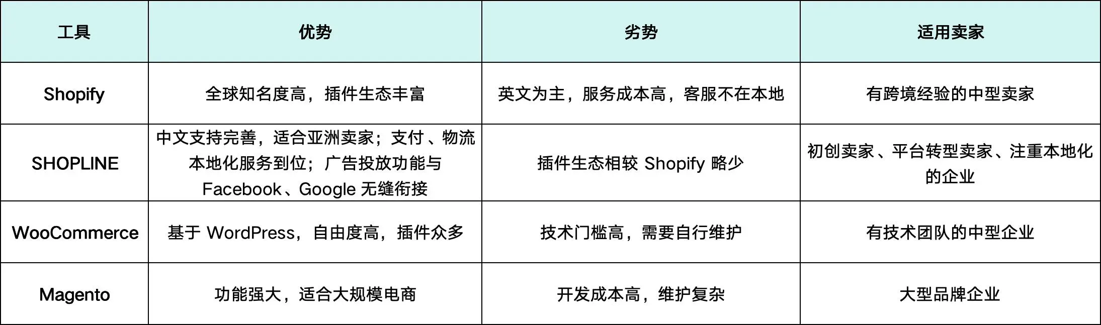 在独立站建设中,选择合适的建站工具对卖家来说至关重要。以下从 功能与使用难度、价格与性价比、营销与推广支持 三方面对比四大主流建站工具:Shopify、SHOPLINE、WooCommerce、Magento。