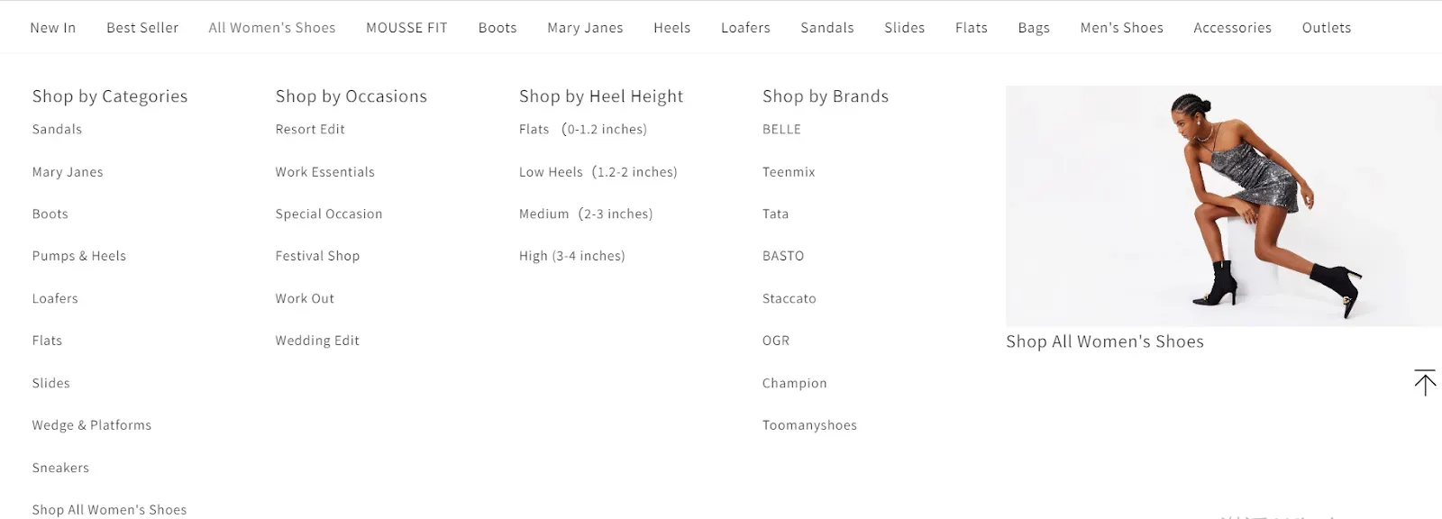 从出海方面,NEWBELLA主要通过品牌独立站的渠道来进行销售。通过浏览NEWBELLA官网,我们可以看到他们在导航栏中将产品进行了细分,并使用选购类别、场合、鞋跟等多个维度进行了划分,这样消费者可以根据自己的需求快速找到所需的鞋子,采用分类方式方便了消费者的选择过程。