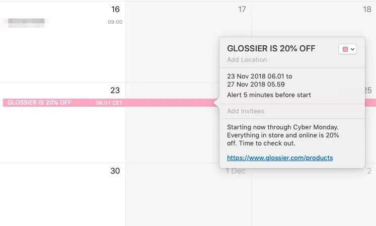 针对潜在消费者,我们最好在黑五活动开始之前发送提醒邮件,提前占领消费者心智,告知他们促销产品以及促销力度,并且附上可供下载的.ics文件,这样消费者下载之后,活动时间、内容和链接就会自动存储在日历上,到了黑五当天,就会弹出提醒信息。