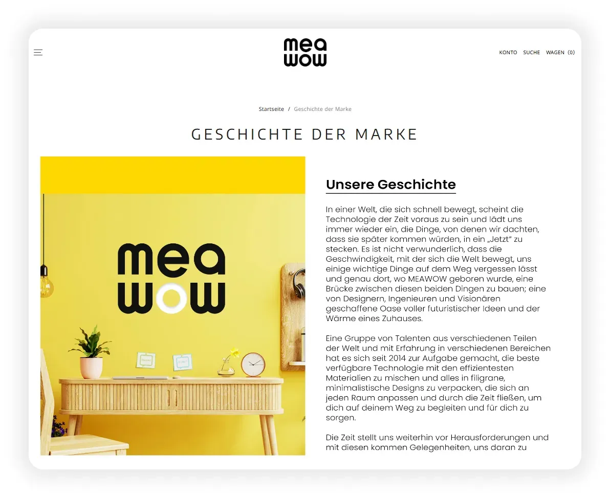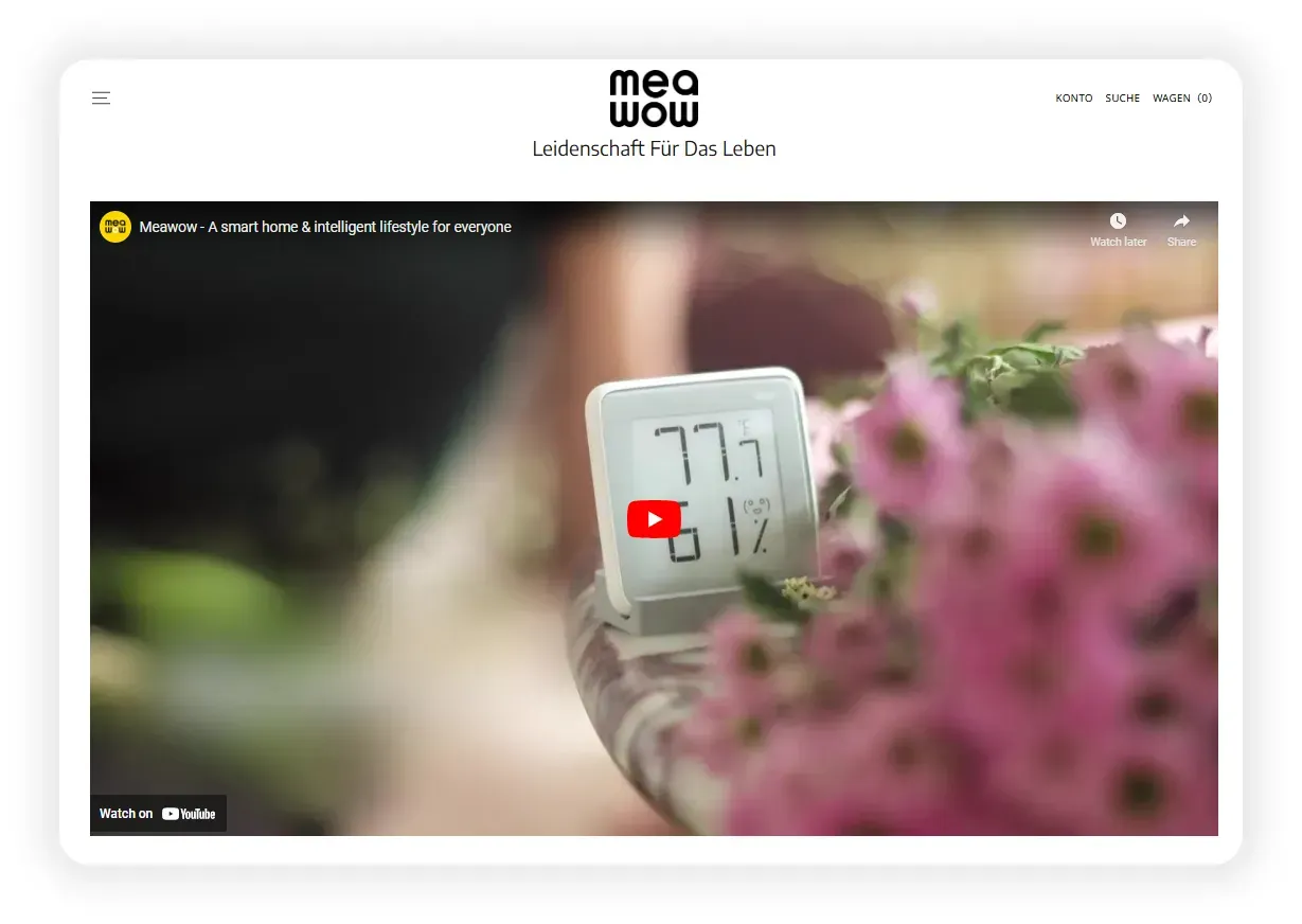 以SHOPLINE客户Meawow秒秒测的独立站为例,不仅通过文字的方式讲述了品牌的发展历史,还在网站主页通过视频的方式传达产品理念,使用户能够更深入地认识并理解品牌价值。
