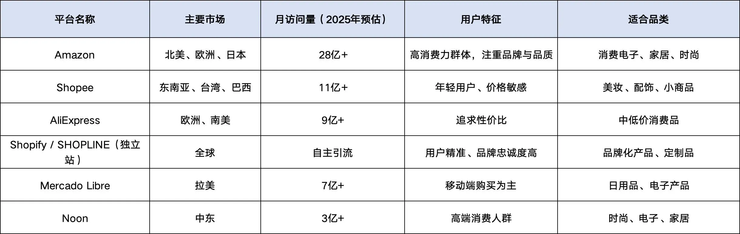 从流量规模看,Amazon 仍是全球跨境电商平台的王者,但独立站模式(SHOPLINE、Shopify)的用户质量更高,复购率远超平台型卖家。