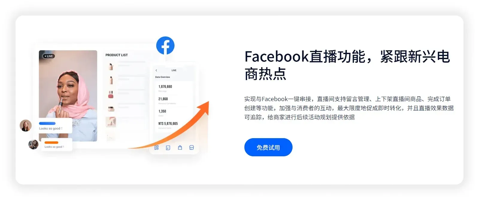 SHOPLINE支持独立站商家在Facebook上进行多样营销,除了能够为Facebook直播提供强大功能支持,还能够自动同步商品Feed到Facebook,在Facebook上实现贴文销售,增强客户互动,帮助您轻松提高营销转化。
