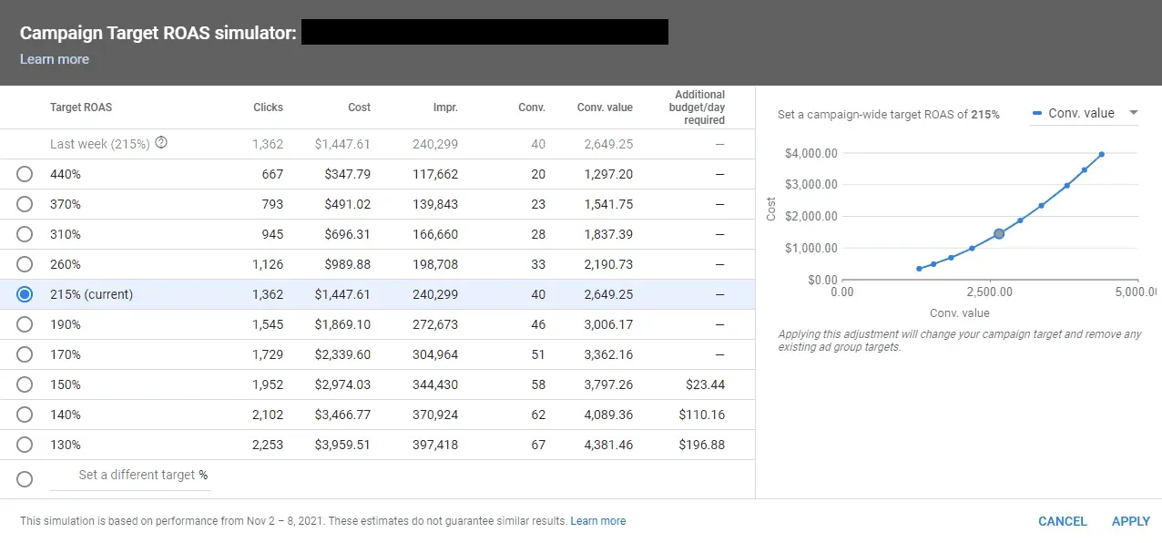 如需更多预算预测,我们建议您使用Campaign Target ROAS Simulator。该工具会评估您当前的广告系列广告支出和竞争对手的行动,以估算您在更改预算时会看到的增长。
