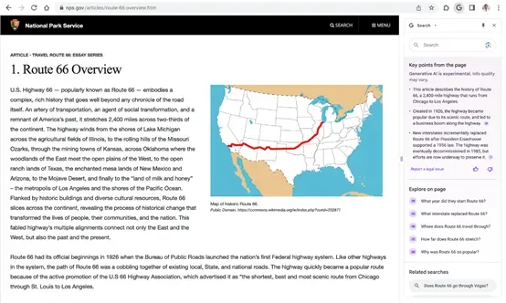 当我们浏览有大量文本网页时,从海量的文字中找出关键知识点并不容易。SGE提供了自动总结网页知识要点的功能,例如,查看美国66号公路的历史。官方对该公路进行了冗长的介绍,观感不佳、难找知识点。