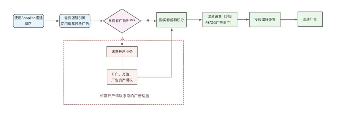 入驻SHOPLINE,购买投流营销套餐,通过SHOPLINE的诸葛广告智能投放系统,选择谷歌购物作为投放渠道。