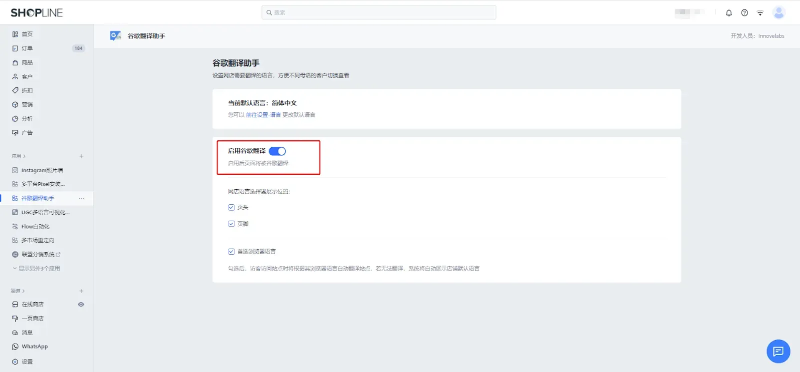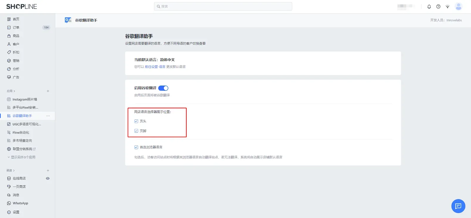 注意:首选浏览器语言功能的生效不依赖于页头页脚的组件,若您的谷歌翻译组件在页头页脚都没有开启但是开启了首选浏览器语言,功能仍可以正常在页面生效。