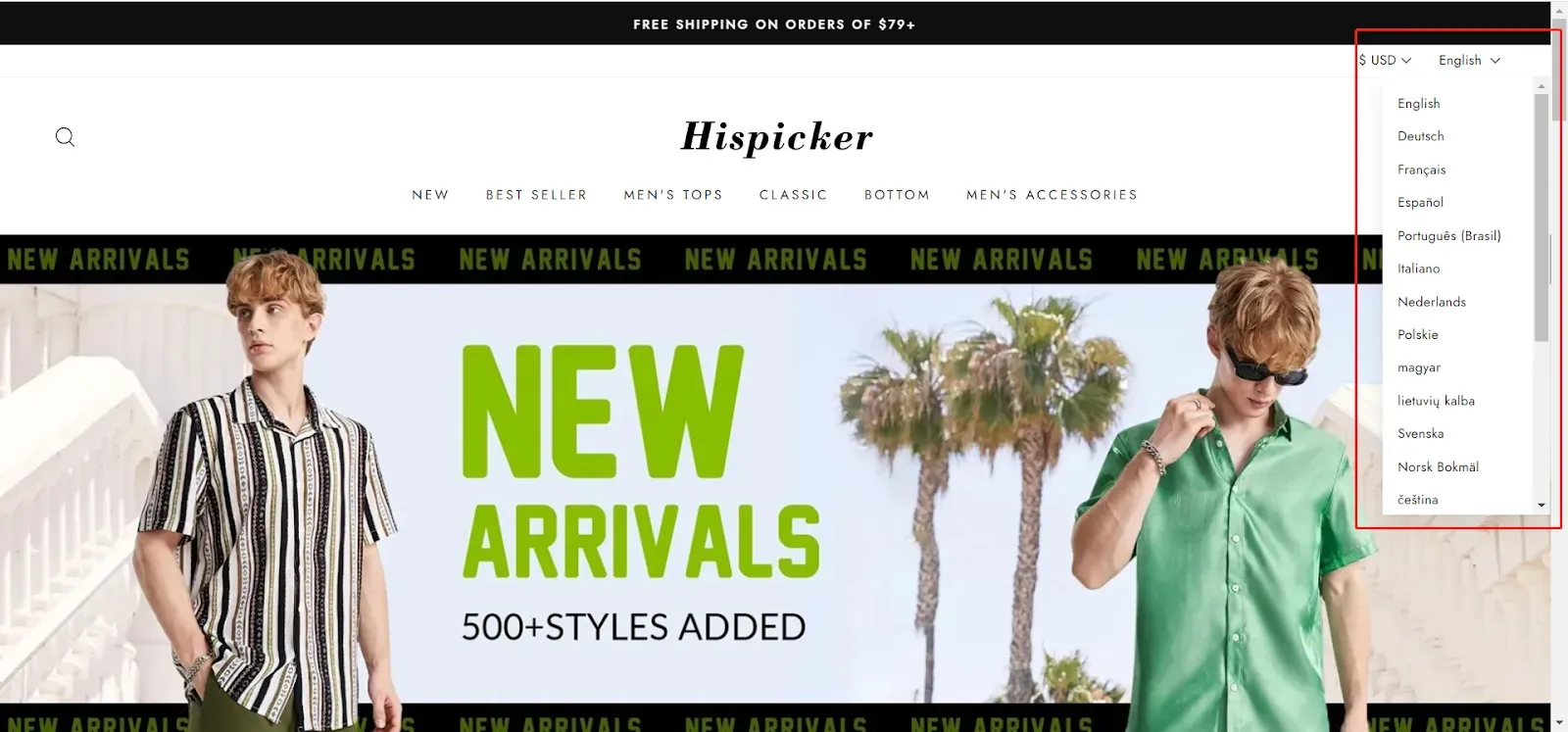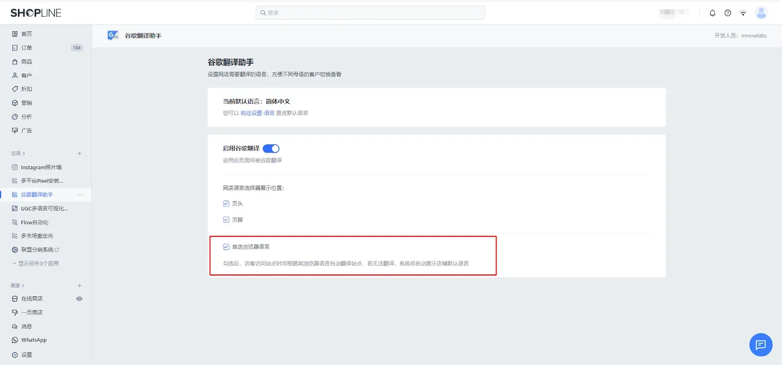 开启首选浏览器语言后,若访客的浏览器语言存在于语言列表中,则当访问时站点语言将自动翻译至浏览器语言。若该浏览器语言不在语言列表里则会自动翻译成店铺默认语言。