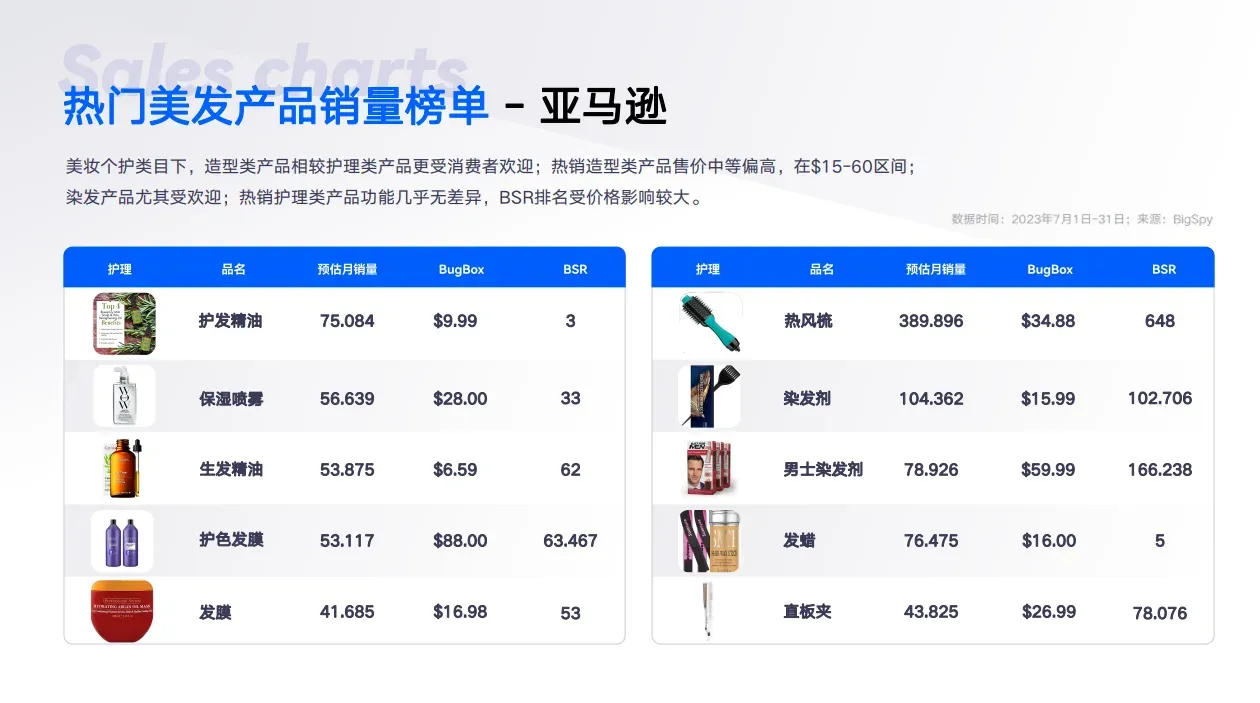 而在亚马逊的美妆个护类目下,造型类产品相较护理类产品更受消费者欢迎。热销的造型类产品售价中等偏高,通常在$15-60的价格区间。尤其是染发产品在这个平台上尤其受欢迎。另外,我们还发现热销的护理类产品在功能上几乎没有太大差异,而销量排名(BSR)很大程度上受价格的影响。
