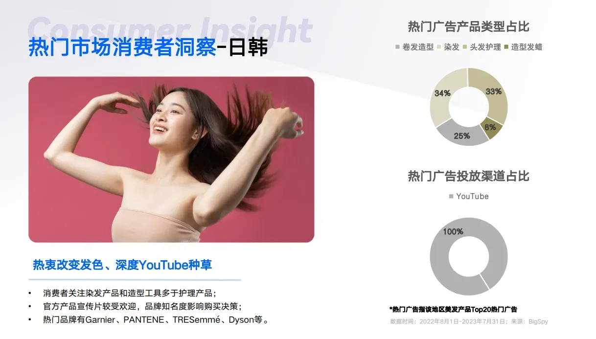 文章对消费流行趋势主要是从两个方面进行讨论,一是在地区上:对日韩、欧美、东南亚三个跨境电商的热门市场展开探究,发现:各地区的消费者都对改变自身发型的需求比护发更大,像日韩,他们更倾向于染发,在欧美、东南亚则会更侧重于卷发、直发。另外,无论是大牌或是小众品牌,消费者们购买时,都会考虑其品牌因素,不买无名产品。最后,在品牌营销上,日韩、欧美都会更倾向于品牌官方的宣传,而在东南亚,更多品牌则采用素人宣传、用户内容自创。