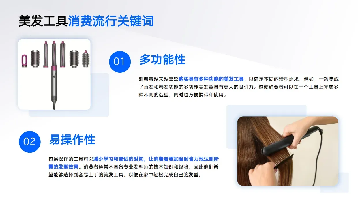 二是在产品亮点上,研究发现,2023年消费者购买美发工具更注重四大特点,分别是:多功能性、易操作性、个性化、头发低损,可见,在美发的问题上,消费者除了对打造个性化发型的追求外,在功能多、方便、健康的问题上也格外重视,商家们应根据这些新趋势来研发有竞争力的产品。