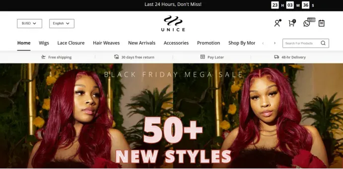 Unice品牌在假发的质地造型上十分丰富,如,波浪卷造型的假发就分为深波浪、宽松波浪、自然波浪等;假发颜色上基本都是市场流行的发色,如蜂蜜金色、酒红色、姜橙色等;假发的花边设计上,有蕾丝假发、V部分假发、4×4闭合假发、头带假发、U形假发等,甚至连假发上的刘海都有很多细致造型。