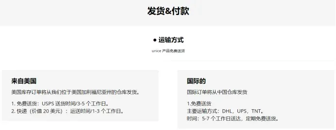 针对美国消费者,将从加利福尼亚州的仓库发货,并承诺3-5个工作日送达;针对国际消费者,UNice将采用DHL、USPS、TNT等主要运输方式,承诺5—7个工作日送达,定期免费送货。