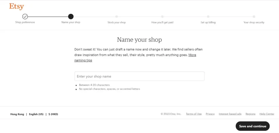 店铺名字需在4-20个字符之间,没有空格和特殊字符;店铺名称不能与现有的Etsy店铺名称重合或侵犯他人商标。