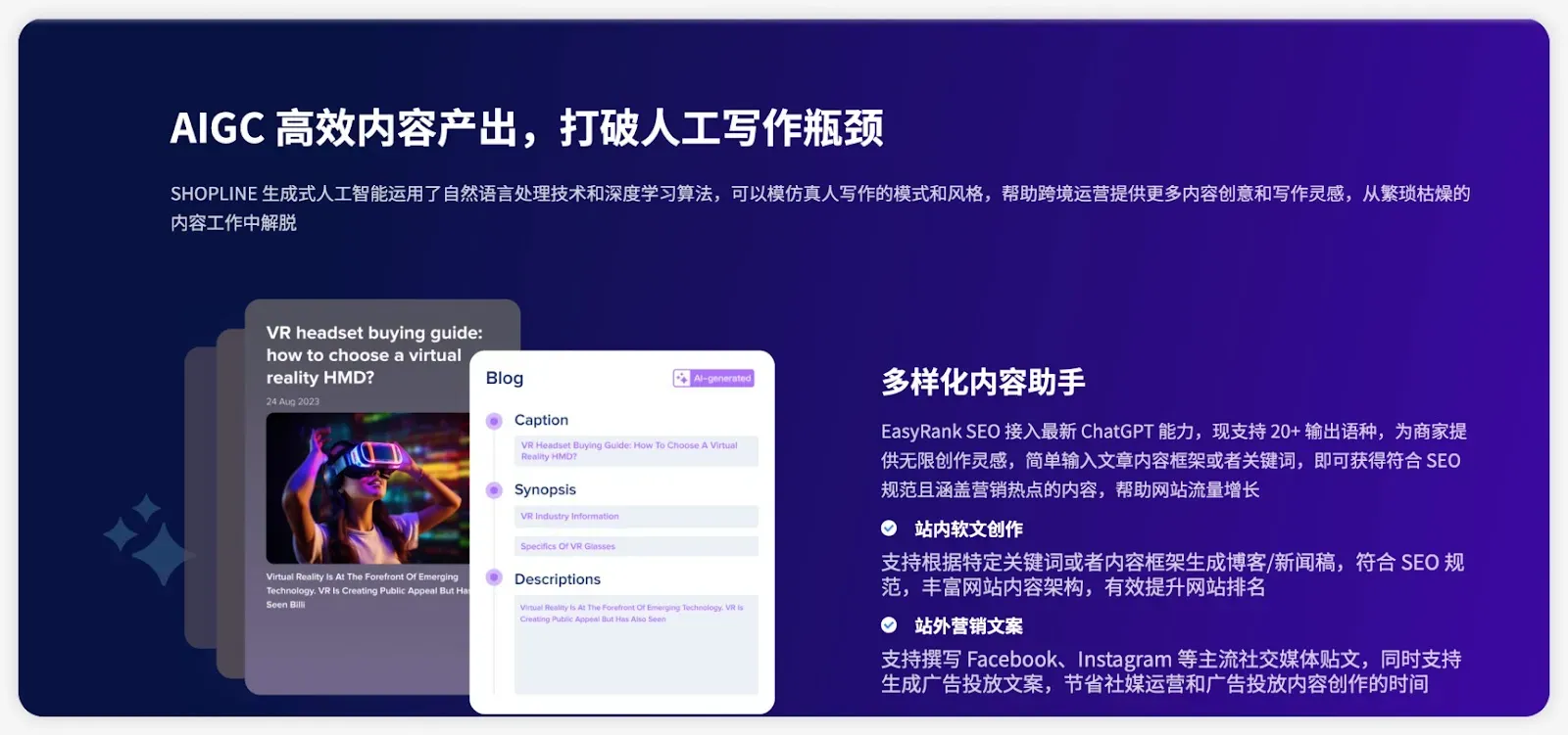 在广告领域,抓住眼球的文案和视觉设计至关重要。商家需要凸显产品的独特卖点和品牌形象,以便在广告竞争中脱颖而出。SHOPLINE AI能够帮助商家通过高质量的图片和精炼的文案来吸引目标受众,同时支持撰写适配Facebook、Instagram等主流社交媒体的贴文。此外,SHOPLINE还能辅助生成广告投放文案,极大节省了社交媒体运营和广告内容创作的时间,提升了营销效率。