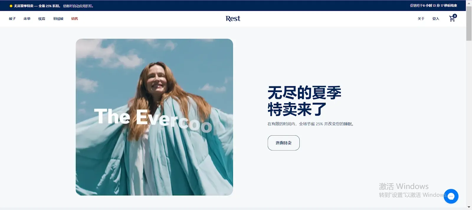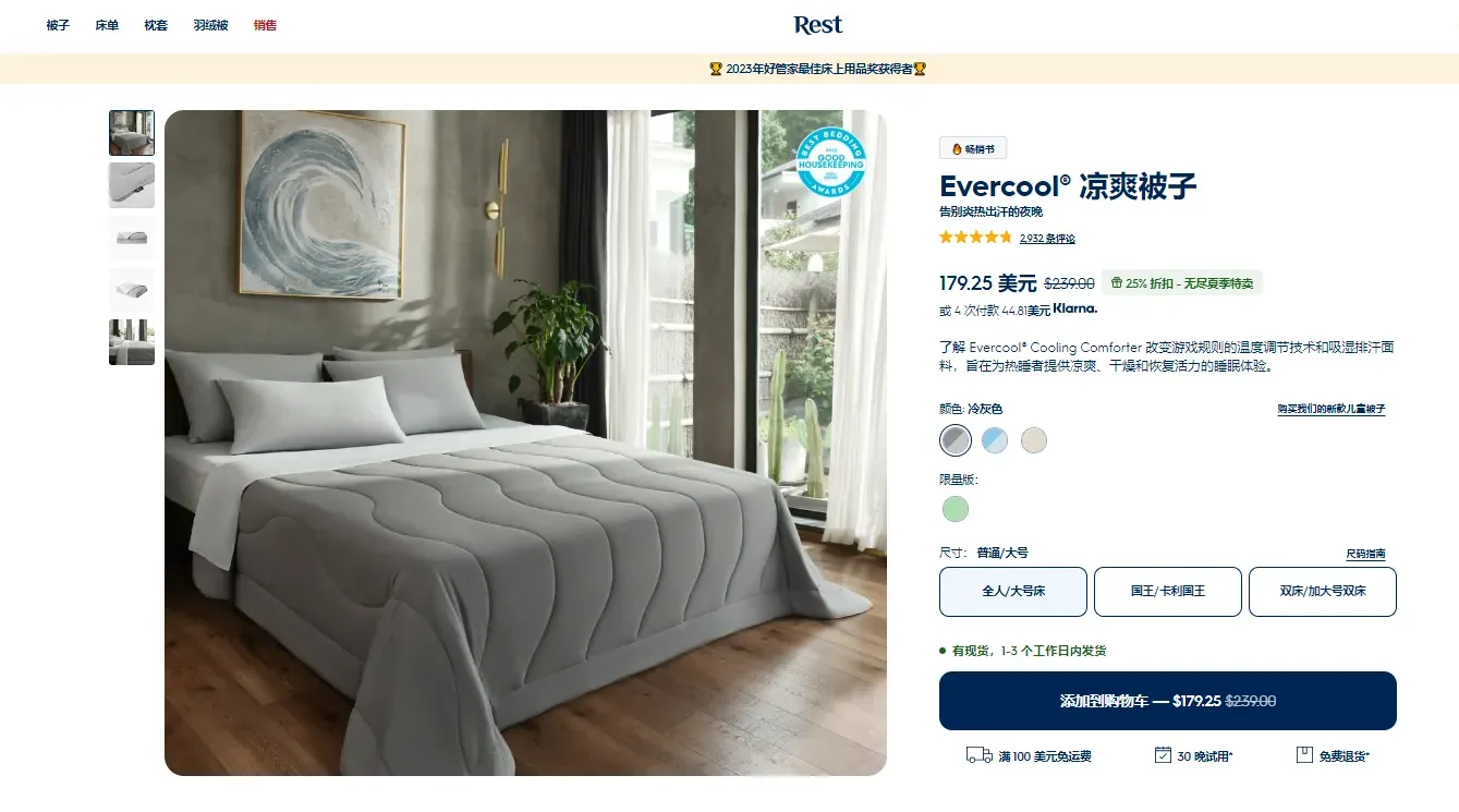 Rest家居的独立站网站设计与其主要销售的产品——被子、床单等非常匹配。尤其是与其主打产品——凉被的配合度更加完美。深蓝色的运用让人联想到广阔的天空和宁静的海洋,给人一种烂漫且凉爽的感觉。当消费者看到这样的配色时,会在心理上产生清凉、爽快的感受,与Rest家居希望传递给用户的感觉完美契合。这种配色选择巧妙地将产品特点与品牌形象相结合,为用户营造了一种与产品相符的视觉体验,增强了品牌的一致性和吸引力。