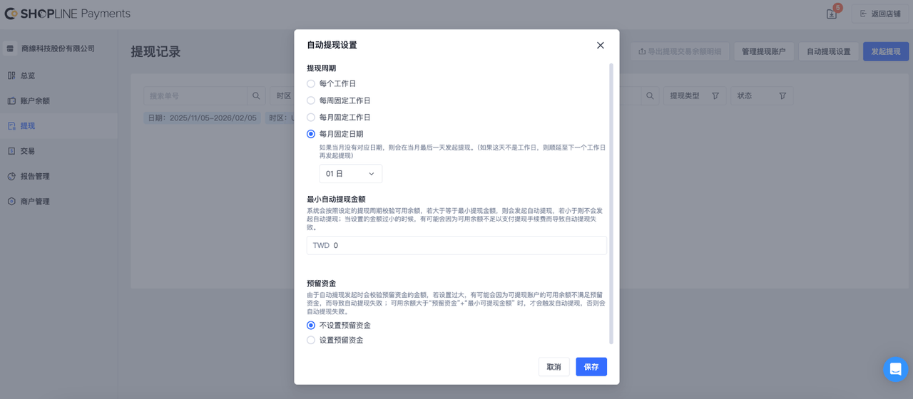 而当可用余额大于「保留可用余额+最小提现金额」时,系统才会触发自动提现。这不仅确保资金安全留存在账户中,也让商家能以更高的主导权,精细化管理现金流,实现真正的财务自主。