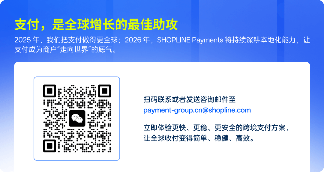 扫描图中二维码,或发送咨询邮件至 payment-group.cn@shopline.com,立即体验更快、更稳、更安全的跨境支付方案,让全球收付变得简单、稳健、高效。