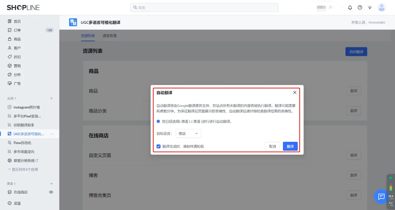 UGC全称User-Generated-Content,在SHOPLINE页面中的表现则是您赋予您的资源的文案,如商品的标题、商品的描述、博客的标题,博客的描述等。使用UGC多语言可视化翻译插件,您可以在可视化的界面编辑您的UGC字段的语言表述,为消费者提供更优质更精细的语言表述。