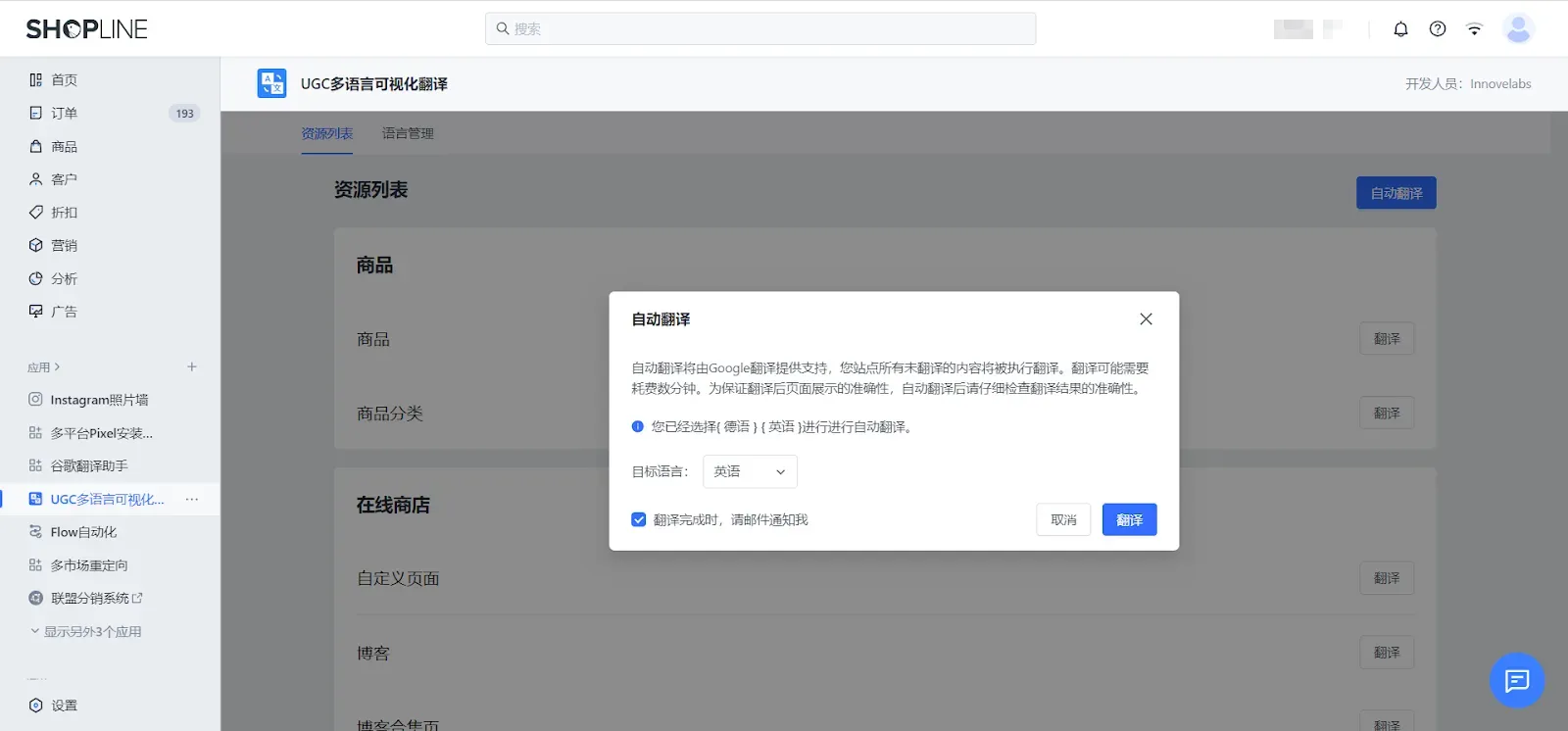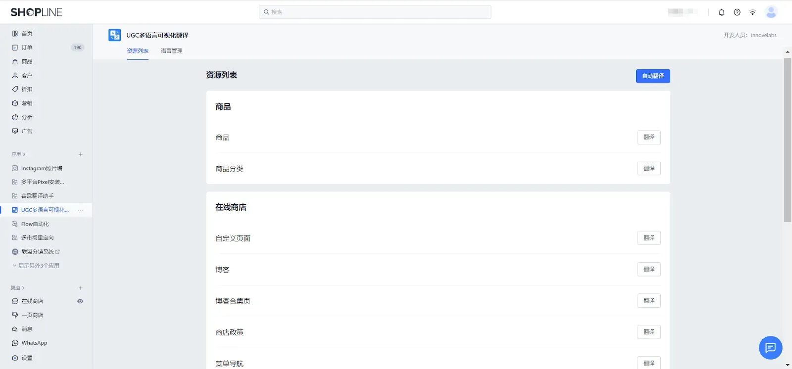 插件安装授权完毕后,您将在插件中看到资源列表页。此时您可以选择您想要翻译的资源对象进行翻译。如选择商品资源时,您将可以对您店铺中的商品的标题、描述、SEO文案等UGC字段做翻译。目前插件支持对「商品」、「在线商店」、「模板」、「支付方式」以及「折扣」板块进行UGC多语言可视化翻译,后续将补充「首页SEO」「营销」等其它板块~~