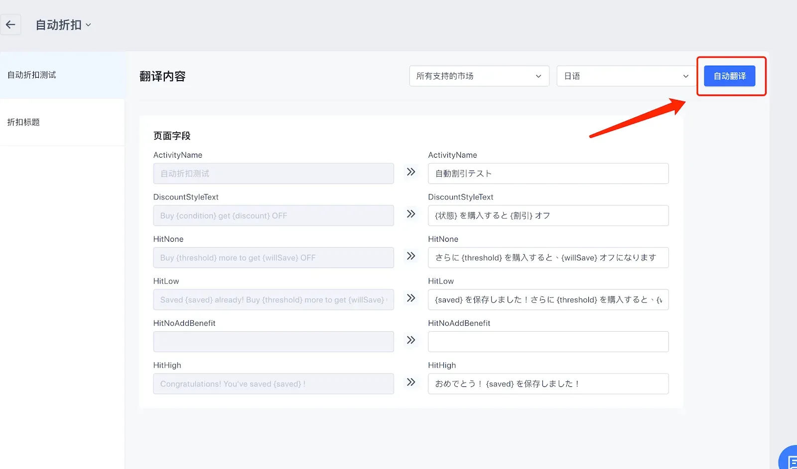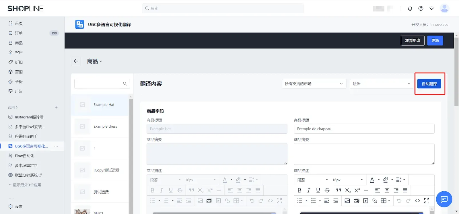 除此之外,UGC多语言可视化翻译插件还有全站自动翻译能力,您可以先将全站语言进行自动翻译再在自动翻译的基础上对相应字段进行精准修改和校正,大大提高翻译效率!