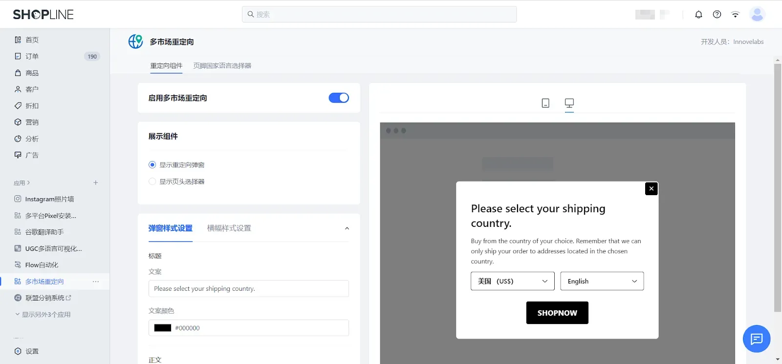 2.2启用多市场重定向并且选择需要配置的组件和组件对应的样式,您可以在右侧看到相关组件的效果预览
