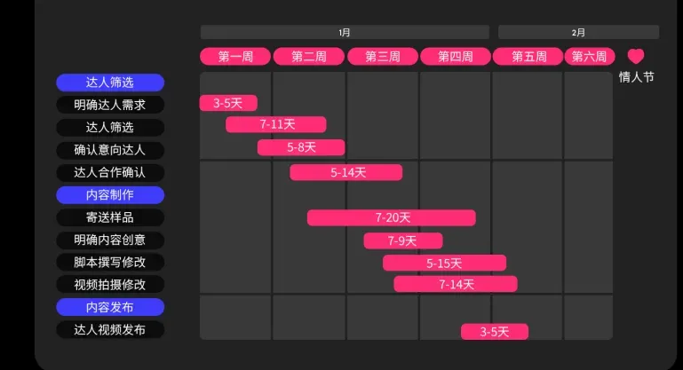 除了选择合适的红人,还需要做好时间的规划,保证如期上线。需要注意的是,节日期间红人档期紧张,应提前至少1.5个月预定红人档期,并且该特殊节点,红人合作的价格也有所溢价,大概在30%左右。以下是TikTok官方所推荐的时间安排,可供参考: